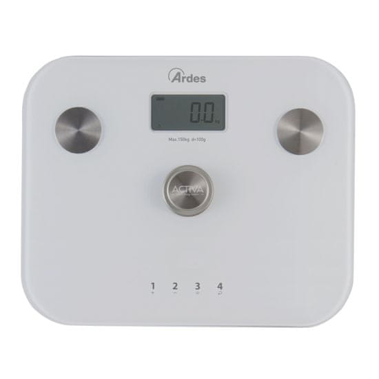 Elegantna več funkcijska digitalna osebna tehtnica ACTIVA – ARDES. Površina iz kaljenega stekla. Tehtnica ne potrebuje baterij. Napajanje s pritiskom sredinske tipke. Tehtanje, merjenje telesne maščobe, merjenje vode v telesu, merjenje mišične ter kostne mase in indeksa telesne mase. Shranjevanje podatkov za 4 osebe. Nosilnost do 150 kg. Neto teža 1,35 kg. Dimenzija izdelka (DxŠxV) 32 × 26 × 4,5 cm.