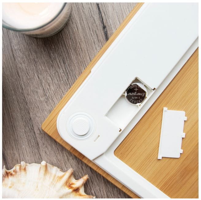 Tehtnica se samodejno vklopi, ko stopite nanjo in izklopi ob sestopu z nje. Za delovanje potrebuje 1 baterijo CR2032, ki je priložena v kompletu. Indikator stanja baterije vas bo opozoril, kdaj jo je potrebno zamenjati. Prav tako vas bo indikator opozoril ob preobremenitvi tehtnice. Štiri nogice SafeGrip, ki so izdelane iz umetne mase, izboljšujejo oprijem in pripomorejo k varni uporabi. Tehtnici je priložen tudi merilni trak.