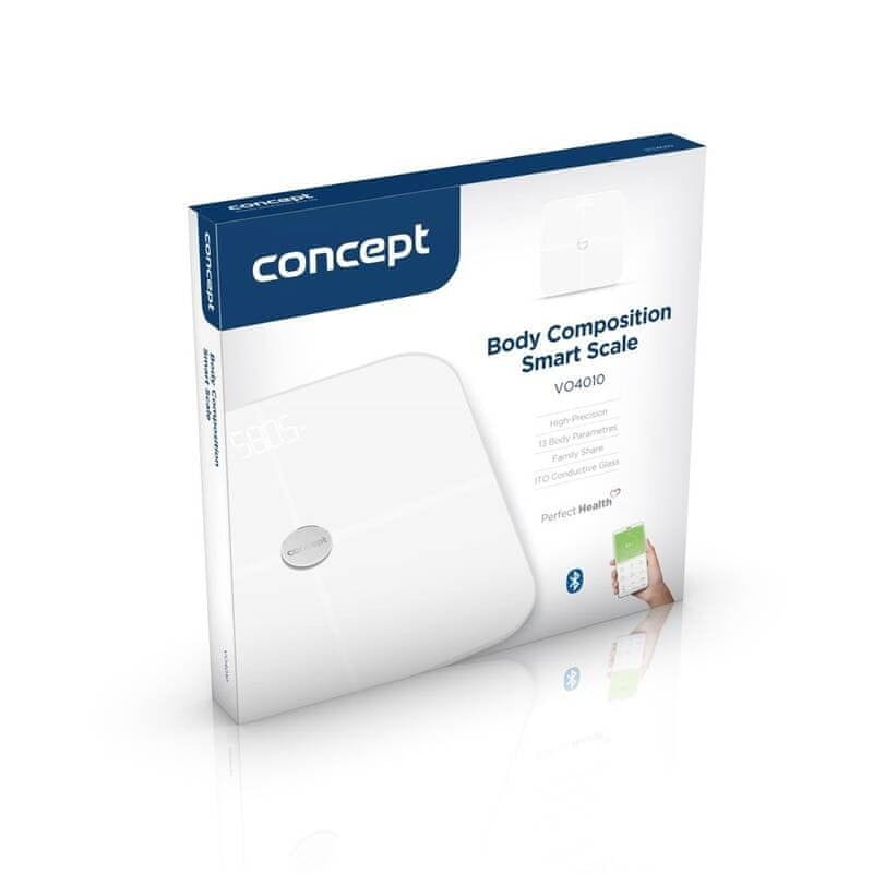 S pametno osebno tehtnico Concept VO4010 Perfect Health boste imeli svoje zdravje pod nadzorom. Poleg telesne teže analizira še 12 drugih parametrov, vključno s telesno maščobo, mišično maso in presnovno starostjo. Nosilnost je 180 kg, najmanjša merljiva vrednost pa 0,2 kg.