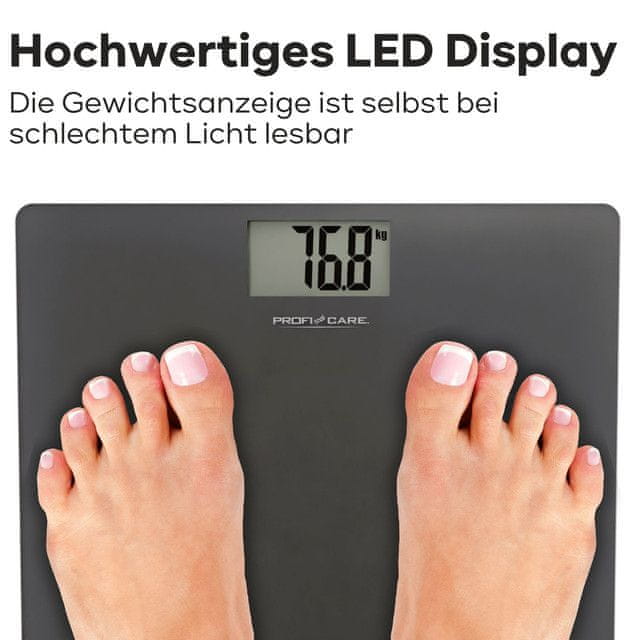 Elektronska osebna tehtnica ProfiCare PW 3122 je opremljena z lahko berljivim, visokokakovostnim zaslonom LCD, ki vam zaradi pretvorljivih enot omogoča priročno spremljanje tehtnice v kilogramih, funtih ali kamnih. Z merilnim razponom od 5 do 180 kg z natančnostjo v korakih po 100 g zagotavlja natančne rezultate. Zaradi samodejnega sistema tehtanja je tehtanje preprosto in hitro. Poleg tega ima izjemno veliko stekleno površino velikosti približno 30 × 30 cm, ki ni le higienična, temveč tudi odporna na praske in enostavna za vzdrževanje. Samodejni izklop podaljša življenjsko dobo baterije, varno stojalo z nedrsečimi nogicami pa zagotavlja stabilnost med uporabo. Indikator nizke porabe baterije vas opozori, kdaj je čas za zamenjavo baterij. Tehtnico lahko uporabljate z 2× 1,5V baterijami AAA (niso priložene), zato jo lahko uporabljate kjer koli, ne da bi jo bilo treba priključiti na električno omrežje.