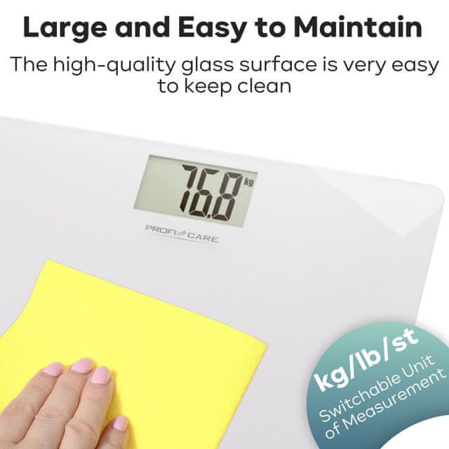 Elektronska osebna tehtnica ProfiCare PW 3122 je opremljena z lahko berljivim, visokokakovostnim zaslonom LCD, ki vam zaradi pretvorljivih enot omogoča priročno spremljanje tehtnice v kilogramih, funtih ali kamnih. Z merilnim razponom od 5 do 180 kg z natančnostjo v korakih po 100 g zagotavlja natančne rezultate. Zaradi samodejnega sistema tehtanja je tehtanje preprosto in hitro. Poleg tega ima izjemno veliko stekleno površino velikosti približno 30 × 30 cm, ki ni le higienična, temveč tudi odporna na praske in enostavna za vzdrževanje. Samodejni izklop podaljša življenjsko dobo baterije, varno stojalo z nedrsečimi nogicami pa zagotavlja stabilnost med uporabo. Indikator nizke porabe baterije vas opozori, kdaj je čas za zamenjavo baterij. Tehtnico lahko uporabljate z 2× 1,5V baterijami AAA (niso priložene), zato jo lahko uporabljate kjer koli, ne da bi jo bilo treba priključiti na električno omrežje.