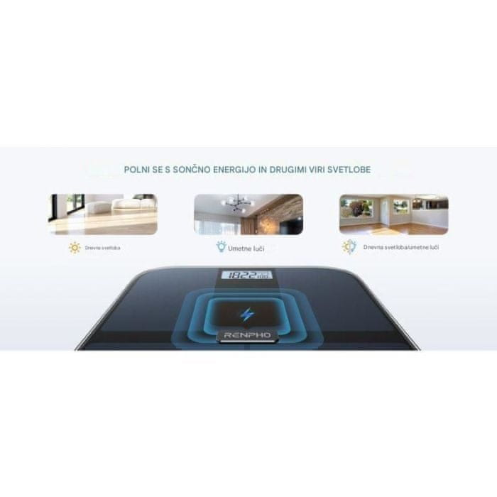 Inovativna in trajnostna tehtnica RENPHO se polni s pomočjo dnevne svetlobe ali umetne svetlobe. Poleg tega elegantna, sodobna zasnova doda stil vsakemu prostoru v vašem domu.