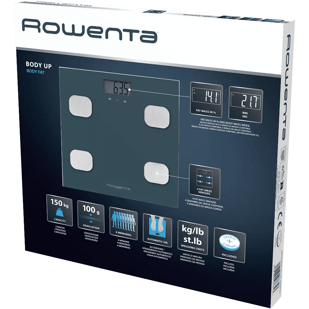 Osebna tehtnica Rowenta BR2520V0 Body Up je elegantna in natančna osebna tehtnica, ki vam omogoča enostavno in zanesljivo spremljanje telesne teže. Zaradi velikega in preglednega LCD-zaslona boste izmerjene vrednosti vedno zlahka odčitali, robustna steklena ploščad pa zagotavlja stabilno in varno uporabo. Tehtnica omogoča natančno merjenje do 180 kg, njen minimalističen in eleganten dizajn pa se odlično poda v vsako kopalnico ali spalnico. Uživajte v hitrem in udobnem spremljanju rezultatov, ki vam pomagajo bolje razumeti svoje telo.