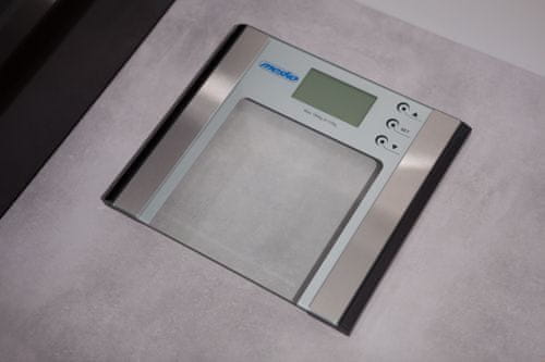 Natančna elektronska kopalniška tehtnica z največjo nosilnostjo 180 kg . Odlična izbira za športnike, ljudi, ki hujšajo, in druge ljudi, ki pazijo na svojo težo. Izdelana iz trpežnega kaljenega stekla zagotavlja varno uporabo in dodaja estetski videz. Visoka natančnost (100 g) omogoča natančno merjenje. Tehtnica ima funkcijo ponastavitve na ničlo in indikatorja: preobremenitve in prazne baterije . Samodejni izklop pomaga varčevati z energijo in povečuje udobje uporabe. Prednost je jasen zaslon , ki zagotavlja enostavno odčitavanje. Tehtnica omogoča merjenje telesne maščobe in vode . Z možnostjo shranjevanja podatkov za 12 oseb lahko napravo uporablja vsa družina za spremljanje sprememb teže in telesne maščobe.