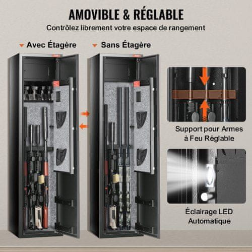 Ta varnostni sef za orožje je zasnovan za varno in priročno shranjevanje vaših pušk in pištol doma. Opremljen z digitalno tipkovnico in pametnim zaklepanjem omogoča hiter dostop ob zagotavljanju največje varnosti. Omara vključuje vgrajeno shrambo odstranljivo polico in nastavljive nosilce za učinkovito organizacijo vašega orožja in dodatkov.