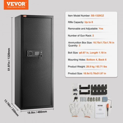 Ta visok varnostni predal za puške je zasnovan za varno shranjevanje in organizacijo vaših strelnega orožja z zmogljivostjo za do 6–8 pušk. Z nastavljivim in odstranljivim stojalom za orožje ponuja prilagodljive možnosti shranjevanja za puške in lovske puške medtem ko priložene škatle za naboje pomagajo ohraniti vaše dodatke urejene. Varnostni predal ima digitalno tipkovnico napreden alarmni sistem in robustno jekleno konstrukcijo ki zagotavlja hiter dostop in maksimalno varnost za vaš dom.