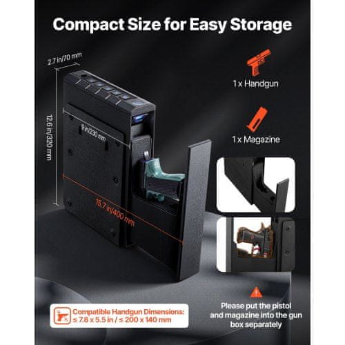 Ta varenega püstoli turvalukk pakub kiiret ligipääsu sõrmejälje, koodi või võtmega. Mõeldud ühe püstoli ja ajakirja hoidmiseks, see sisaldab sisemist valgustust ja kompaktset disaini diskreetseks hoiustamiseks öökapis, kirjutuslaual või autos. Mõõtmed: 230×70×320 mm. Celoten opis