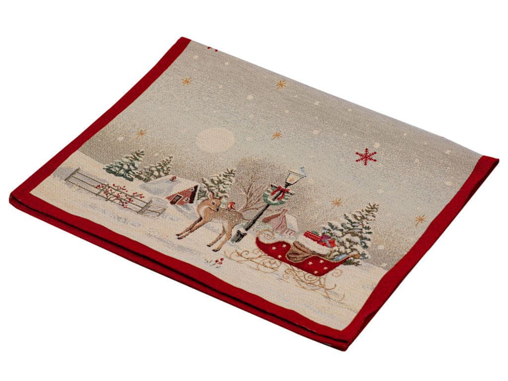 Božični tekač 44×140 cm Božično vzdušje izstopa po svojih izjemnih lastnostih, ki jih bodo cenila številna gospodinjstva. Izdelan je iz kvalitetne tekstilije Gobelin, ki je kombinacija bombaža in sintetičnih vlaken, je odporna na mečkanje in preprosta za vzdrževanje. Tekač z božičnim vzorcem postane okras vsake kuhinje.