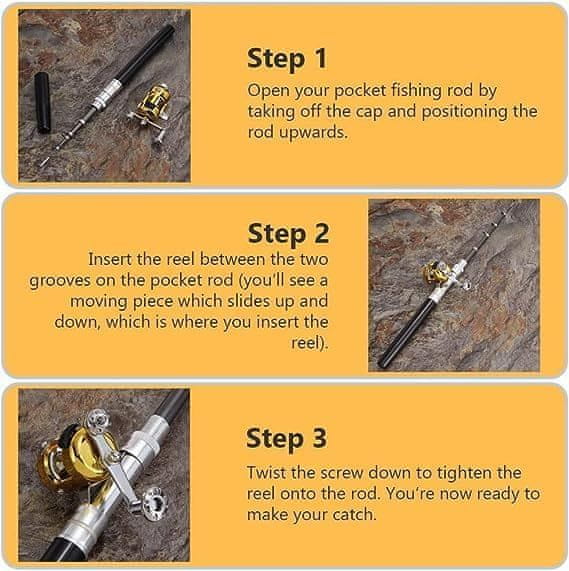 Ribiški komplet sestavlja teleskopsko palico, ki se zloži za enostaven transport in ribiško kolesce z zaščito za palico. Žepna velikost omogoča uporabniku ribiške užitke na vsakem koraku, brez nošnje težke ribiške opreme.