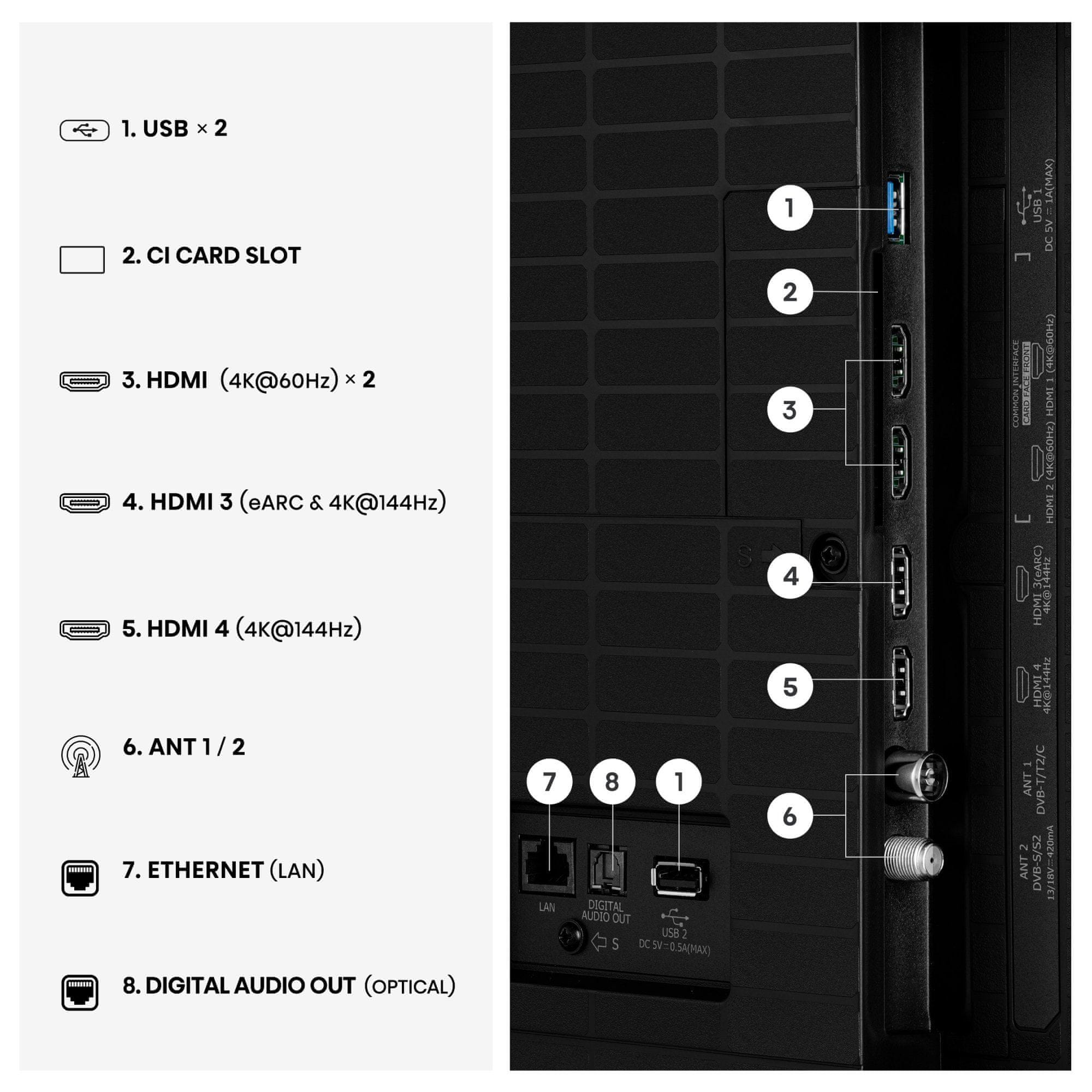 - Štirje HDMI 2.1 vhodi z ALLM, eARC in VRR (144 Hz)