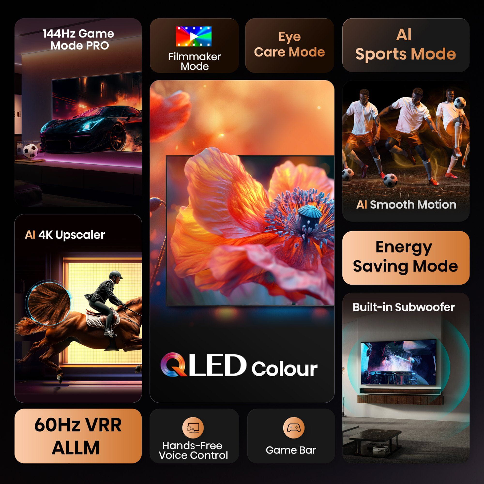 Doživite izjemno tekoče in realistične slike, kjer je vsak gib kristalno jasen. Z napredno tehnologijo AI Smooth Motion in vgrajenima funkcijama MEMC (ocenjevanje in kompenzacija gibanja) ter 3D zmanjševanje šumov, so moteče zameglitve preteklost. Ne glede na to, ali spremljate hitre športne dogodke ali se potopite v akcijske igre, bo vsak gib in nenaden preobrat prikazan z izjemno natančnostjo. Dinamične scene bodo vedno izgledale gladko in živahno.