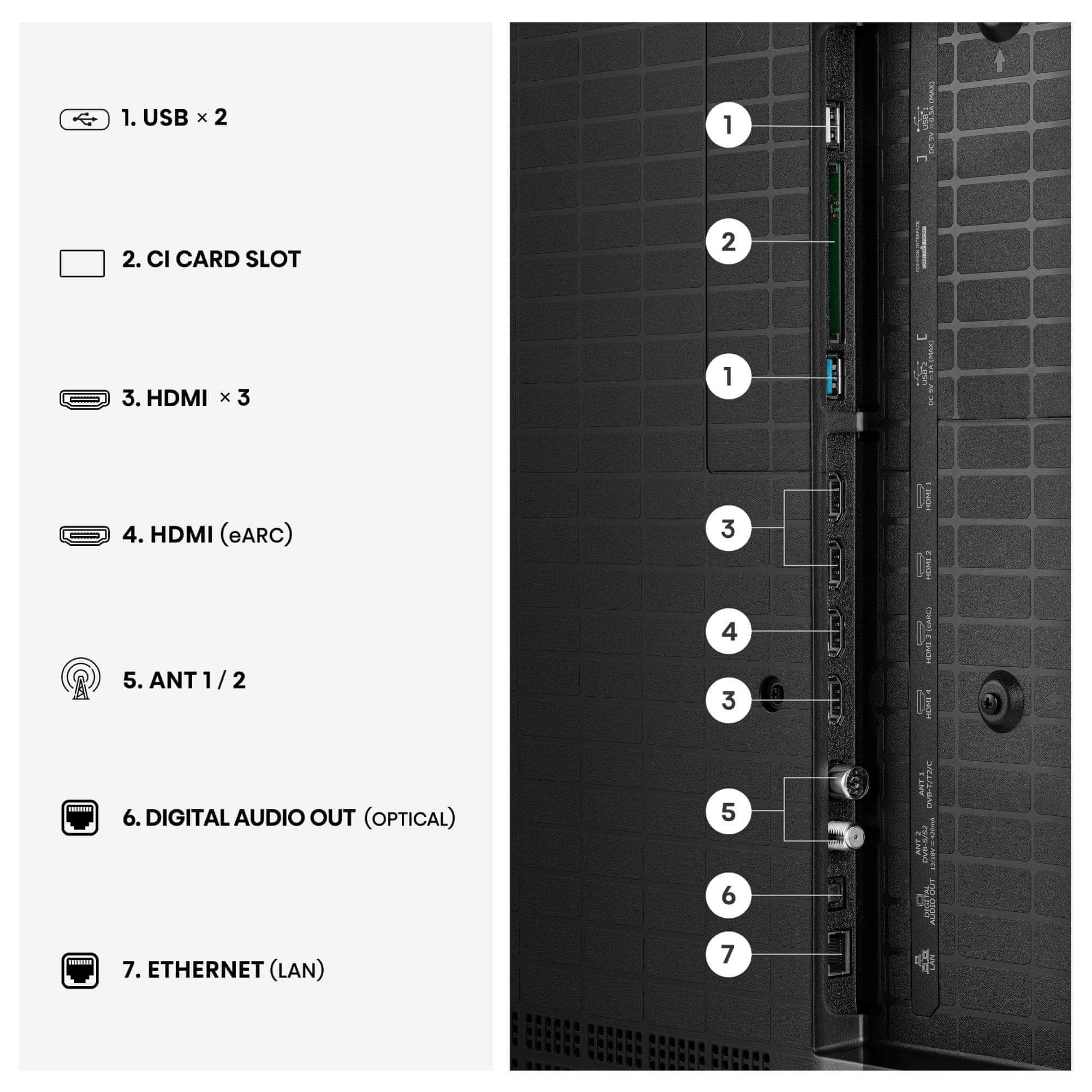 Za popolno sliko vedno in povsod skrbi AI RGB svetlobni senzor, ki samodejno zazna in prilagodi svetlost ter barvno temperaturo. Televizor je opremljen s 4× HDMI 2.1 priključki, ki podpirajo 180 Hz osveževanje pri 4K ločljivosti, ter USB 2.0 in USB 3.0 vhodi. Za okolju prijazen nadzor je priložen daljinski upravljalnik na sončno energijo, ki ga lahko polnite tudi preko USB-C.