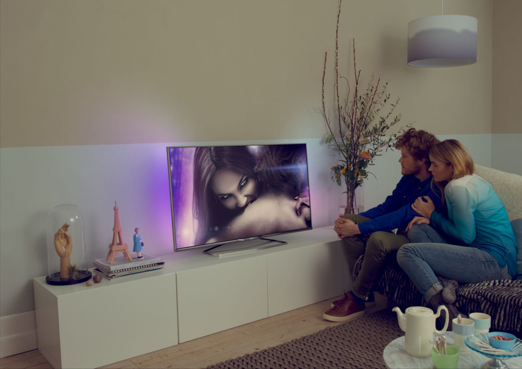 Tehnologija Ambilight razširi zaslon in ponuja pristnejše užitke ob gledanju, saj s strani televizorja projicira širok svetlobni sij na steno okoli sprejemnika.