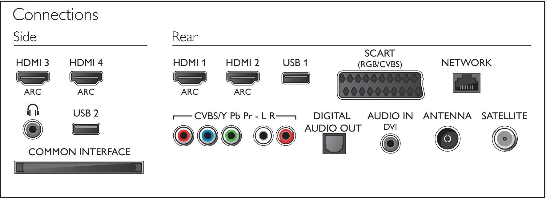 - Ostali priključki: Antena IEC75, S potrdilom CI+1.3, Zvočni vhod (DVI), Standardni vmesnik plus (CI+), Ethernet-LAN RJ-45, Digitalni zvočni izhod (optični), Zvočni vhod L/D, Izhod za slušalke, Storitveni priključek