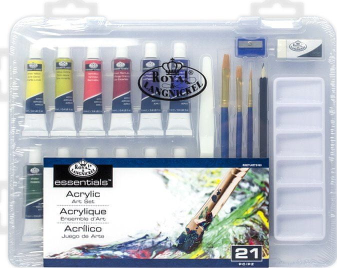 Umetniški komplet v praktičnem, prenosnem paketu za male in velike umetnike, ki radi slikajo. Komplet vsebuje: 3× čopiče – 3 velikosti, 1× brusilnik, 1× grafitni svinčnik, 1× plastično lopatko, 1× belo radirko, 1× belo plastično paleto – 6 posodic, 12 akrilnih barv (rumena, oker, svetlo rdeča, rdeča, temno modra, svetlo modra, temno zelena, svetlo zelena, svetlo rjava, temno rjava, črna, bela). Ameriška kakovost in 60-letna tradicija Royal +amp; Langnickel prihajata k vam domov. Ta svetovno priznani proizvajalec umetniških izdelkov je vodilni na trgu prodaje umetniških potrebščin. Izdelki so skrbno zasnovani in oblikovani tako, da izpolnjujejo najvišje standarde.