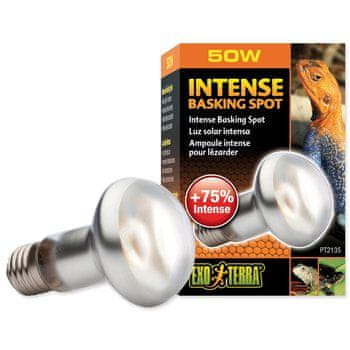 ExoTerra Intense Basking Spot je žarnica, zasnovana posebej za kopanje puščavskih in tropskih vrst plazilcev. Toplota in svetloba v siju se zaradi reflektorske plasti povečata za 75 %. Točkovni vir ohranja temperaturni gradient v terariju, kar je izjemno pomembno za plazilce. Toplotni stožec je usmerjen v eno samo točko, zato ni nepotrebnih izgub. Ko se bo žival želela ogreti, bo zlezla tik pod žarnico, kjer je temperatura razmeroma visoka, ko pa se bo želela ohladiti, bo poiskala hladnejše mesto v terariju. Žarnica služi le kot vir toplote in vidne svetlobe. Ne oddaja žarkov UVB, ki so bistveni za večino plazilcev. Zato je treba v terarij dodati vir UVB z običajno linearno ali kompaktno fluorescenčno sijalko. Druga možnost je uporaba visokotlačne sijalke, ki hkrati oddaja toploto, svetlobo in UV žarke. Primerno za: vodne in kopenske želve, legvane, bradate agame, kameleone in gekone. Izvedba: 50 W