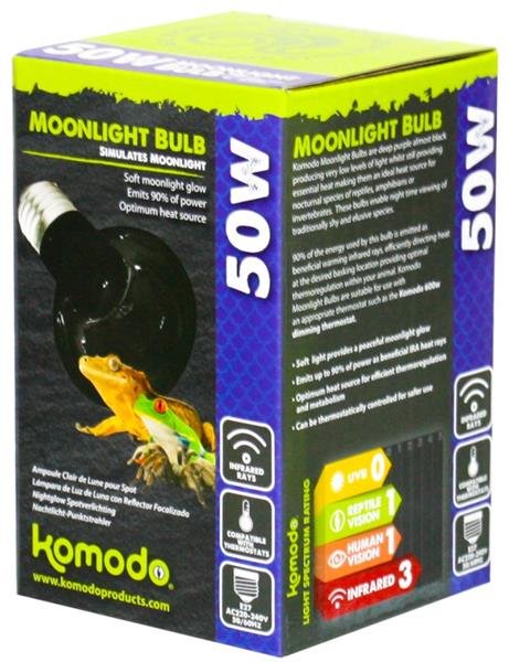 Žarnica Komodo Moonlight Bulb iz temno vijoličnega, skoraj črnega stekla je idealna kot vir toplote za vse vrste nočnih plazilcev, dvoživk in nevretenčarjev. Pridušena „lunina“ svetloba, ki jo oddaja, omogoča opazovanje nočnih aktivnosti tudi zelo plašnih živali. Do 90 % porabljene energije prihaja iz žarnice v obliki toplega sevanja, ki se lahko zaradi oblike žarnice usmeri na izbrano ležišče. Prednosti:
