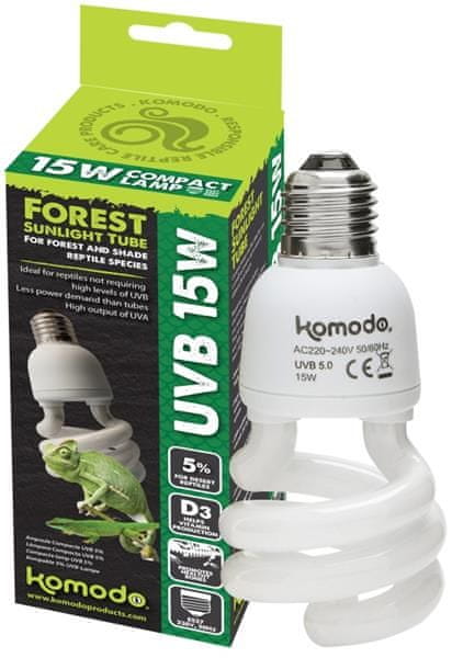Ekonomična kompaktna svetilka Komodo Compact Lamp UVB 5 % je idealna za manjše terarije (največja dolžina 60 cm) in za gojenje plazilcev, ki potrebujejo manj UVB sevanja (npr. deževne vrste). Prednosti: