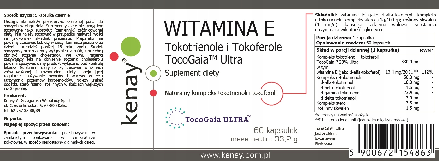 Sestavine : Vitamin E (kot d-alfa-tokoferol), tokotrienolni kompleks, rastlinski skvalen (20 mg/g), fitosterolni kompleks (10 mg/g), kapsula: goveja želatina, humektant: glicerin