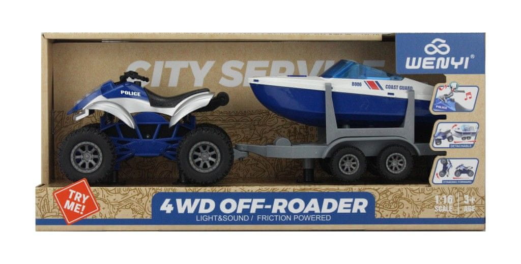 Ta štirikolesnik prinaša veliko zabave s svetlobnimi in zvočnimi učinki! Poleg tega ima snemljivo prikolico in lahko izvaja kaskaderske podvige – lahko stoji na sprednjih kolesih! Svetlobni in zvočni učinki za realistično izkušnjo Odstranljiva prikolica za spremenljivo igro Stoji na sprednjih kolesi Celoten opis