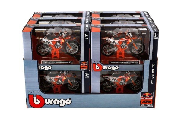 Motocikel Burago KTM 450 SX-F Factory Edition za vse ljubitelje motociklov. Ta model bo navdušil vse male zbiratelje. V merilu 1:18. 12 cm. Dimenzije škatle: 17 × 11 × 7 cm Primerno za otroke od 3. leta dalje