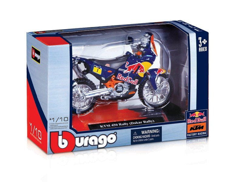 Bburago modeli motociklov v merilu 1:18 iz zbirke RED BULL KTM FACTORY RACING so zbirka modelov Rallye z veliko pozornosti do podrobnosti. Modeli so izdelani iz tlačno ulite kovine s plastičnimi podrobnostmi. Pakirani so v škatli. Ni primerno za otroke, mlajše od 3 let. Mere paketa: 10,8 × 17,1 × 7,1 cm. 3+