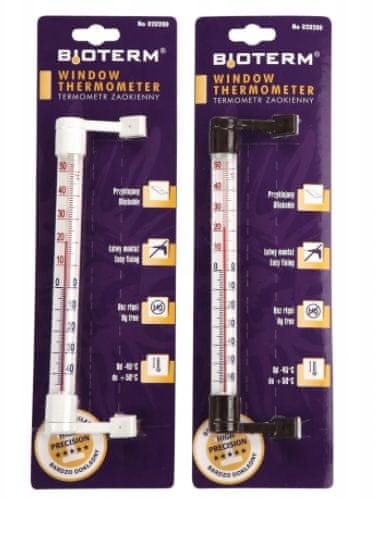 Ta zunanji cevni termometer je zasnovan za merjenje zunanje temperature. Samolepilni – najbolje deluje na mestih z malo neposredne izpostavljenosti UV-žarkom. Varen – brez živega srebra. Na voljo v dveh barvah. Na zalogi je naključna barva. Parametri: Znamka: Brown Material: plastika Prevladujoča barva: bela, rjava; različne barve Temperaturno območje: od –50°C do +50°C Brez živega srebra Dimenzije: 21 × 2 cm x 2 cm
