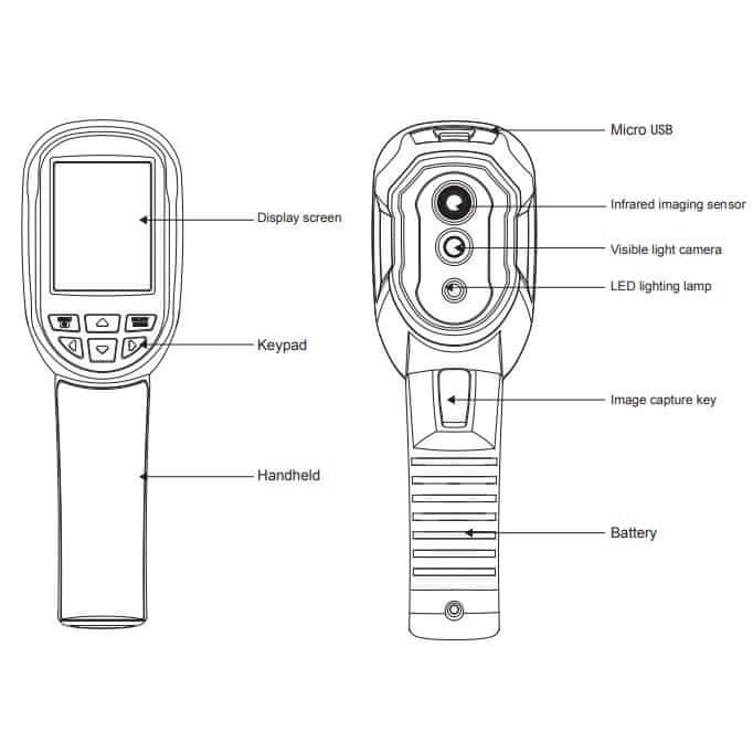 Infrardeča kamera HT-04D ima fiksno goriščno razdaljo in je zelo enostavna za uporabo. Napaja jo vgrajena baterija za ponovno polnjenje tipa 18650, ki omogoča 2–3 ure delovanja infrardeče kamere. Baterijo lahko priročno napolnite s priloženim kablom USB, ki je priključen na električno omrežje, računalnik ali powerbank.