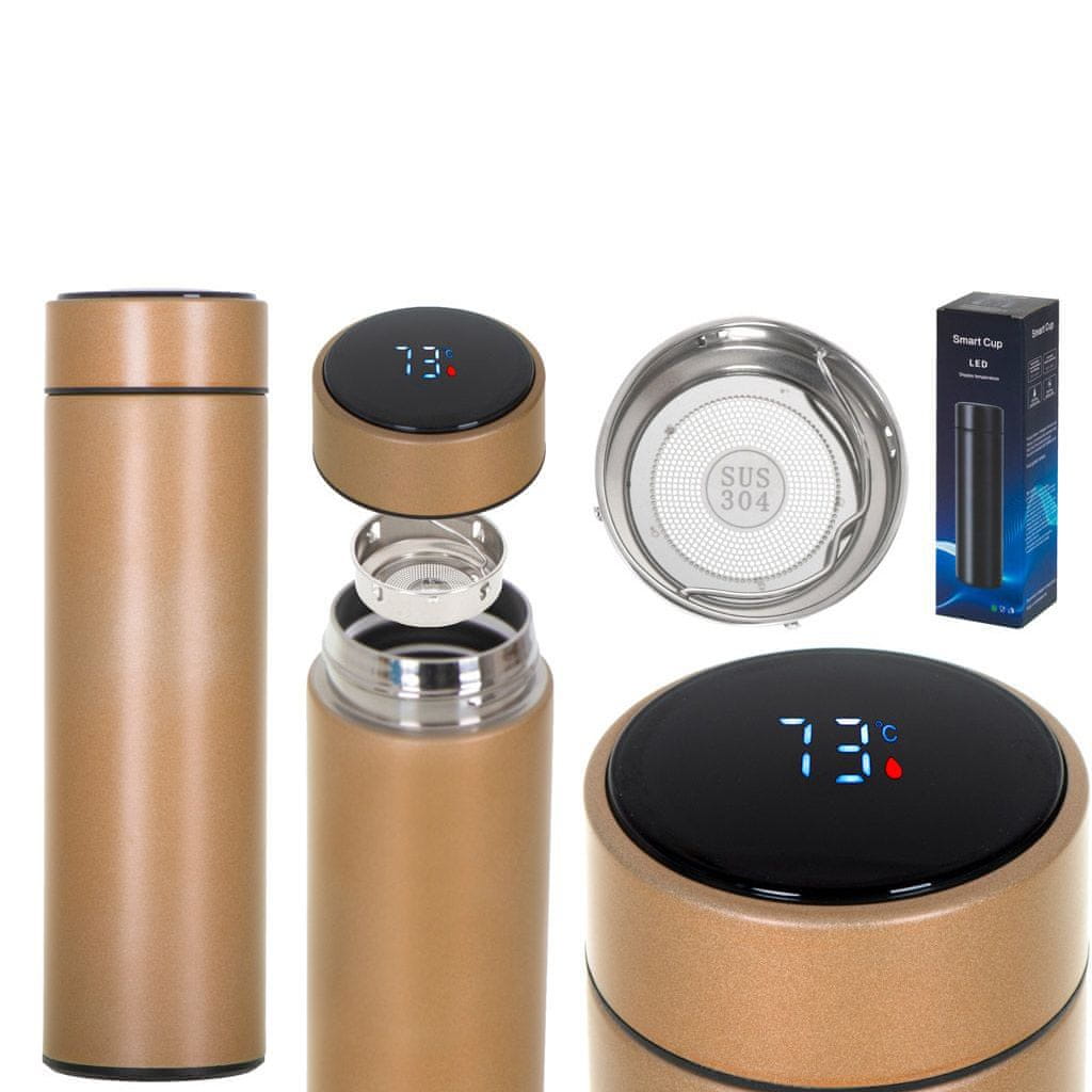Digitalna termovka – prostornina 500 ml, prikazuje temperaturo napitka, primerna za tople in hladne napitke, notranjost iz nerjavečega jekla, cedilo za čaj in usedlino. Celoten opis