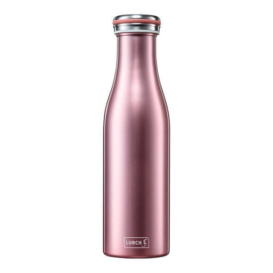Iščete elegantno steklenico iz nerjavečega jekla za vsakodnevno uporabo? Potem je termo steklenica Lurch 500 ml prava izbira za vas. Njena bučkasta oblika v rožnato zlati barvi (rose gold) spominja na stekleničke za mleko. Površina je obdelana s posebnim inovativnim postopkom peskanja, zato je primerna za pomivanje v pomivalnem stroju, a zaradi zagotovila, da ostane njen eleganten površinski zaključek v prvotnem stanju, priporočamo ročno čiščenje. Izdelana je iz nerjavečega jekla 18/8 s patentirano dvojno vakuumsko izolacijo (dvojno steno). Dve plasti nerjavečega jekla (brez BPA) zapirata vakuum, kar zmanjšuje izmenjavo toplote med vsebino in okoljem. Notranja stena iz nerjavečega jekla je prav tako prevlečena z bakrom za shranjevanje toplotne energije in s tem optimizacijo izolacije. Tako vaša pijača ostane hladna do 24 ur. Nerjaveče jeklo je robustno in vzdržljivo, zaradi tega je steklenica popolna za vsakodnevno uporabo, saj je zapiranje termosa popolnoma tesno. 100% tesnost je zagotovljena tudi pri gaziranih pijačah. Velikost odprtine za pitje zagotavlja prijetno izkušnjo pitja ter hkrati olajša čiščenje stekleničke. Zahvaljujoč tanki, brezčasni in elegantni zasnovi lahko termos enostavno pospravite, prilega pa se tudi v najpogostejša držala za skodelice v avtu. Ko smo na poti, je pomembno, da dovolj pijemo, ker nas uravnoteženo ravnovesje tekočin ohranja lepe, zdrave in naše misli fit. Tako imate vedno pri sebi svojo najljubšo pijačo idealne temperature in se lahko odžejate kadarkoli. Dimenzije: 6,5 x h24 cm, teža 260 gr
