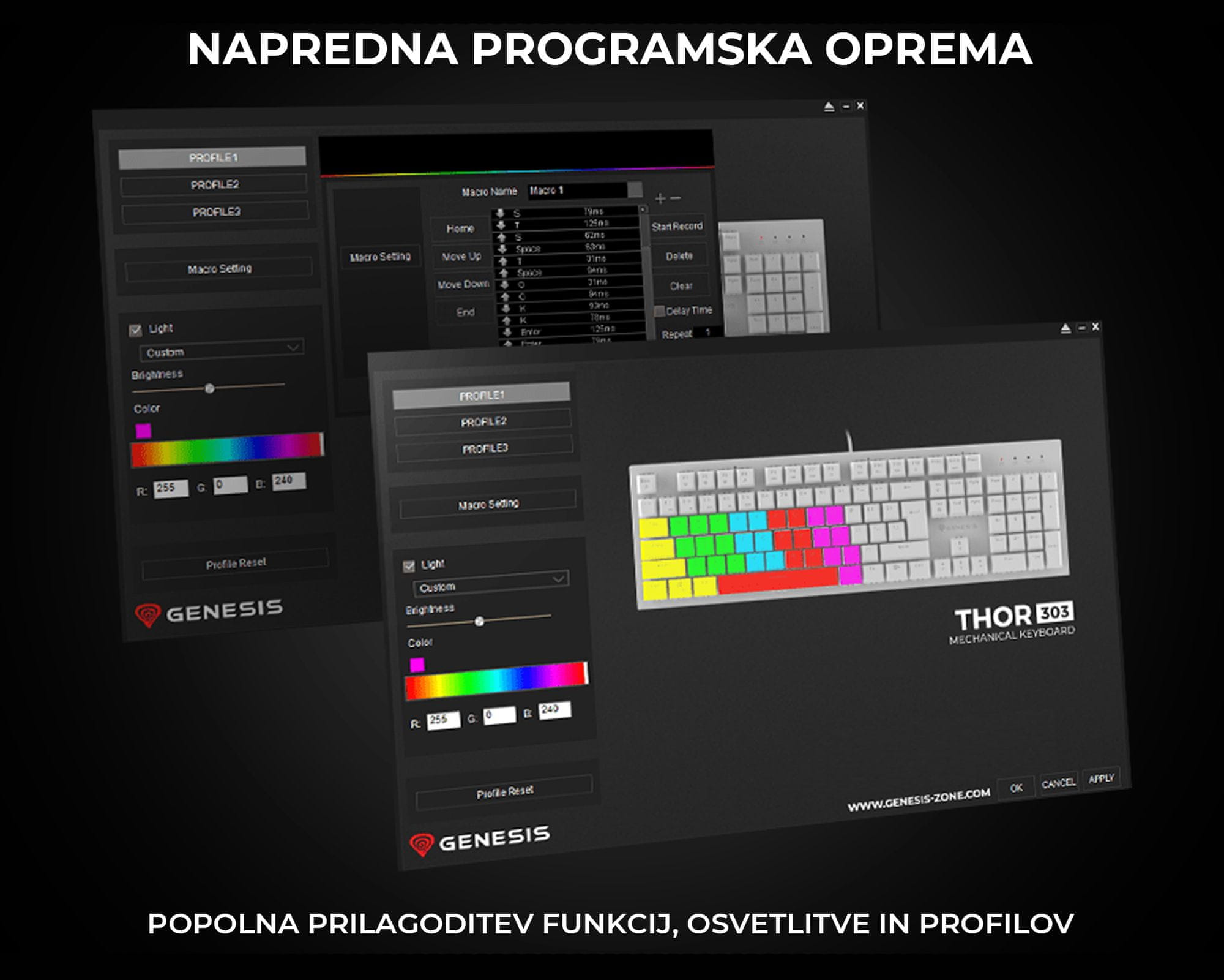 Tipkovnica ima programsko opremo, ki vam omogoča popolno prilagoditev. Izberite svoj najljubši način osvetlitve, določite smrtonosne kombinacije in nastavite makre ter profile. Zahvaljujoč vgrajenemu pomnilniku si naprava zapomni vse nastavitve, in vam je po priklopu na drug računalnik ni treba znova nastavljati.