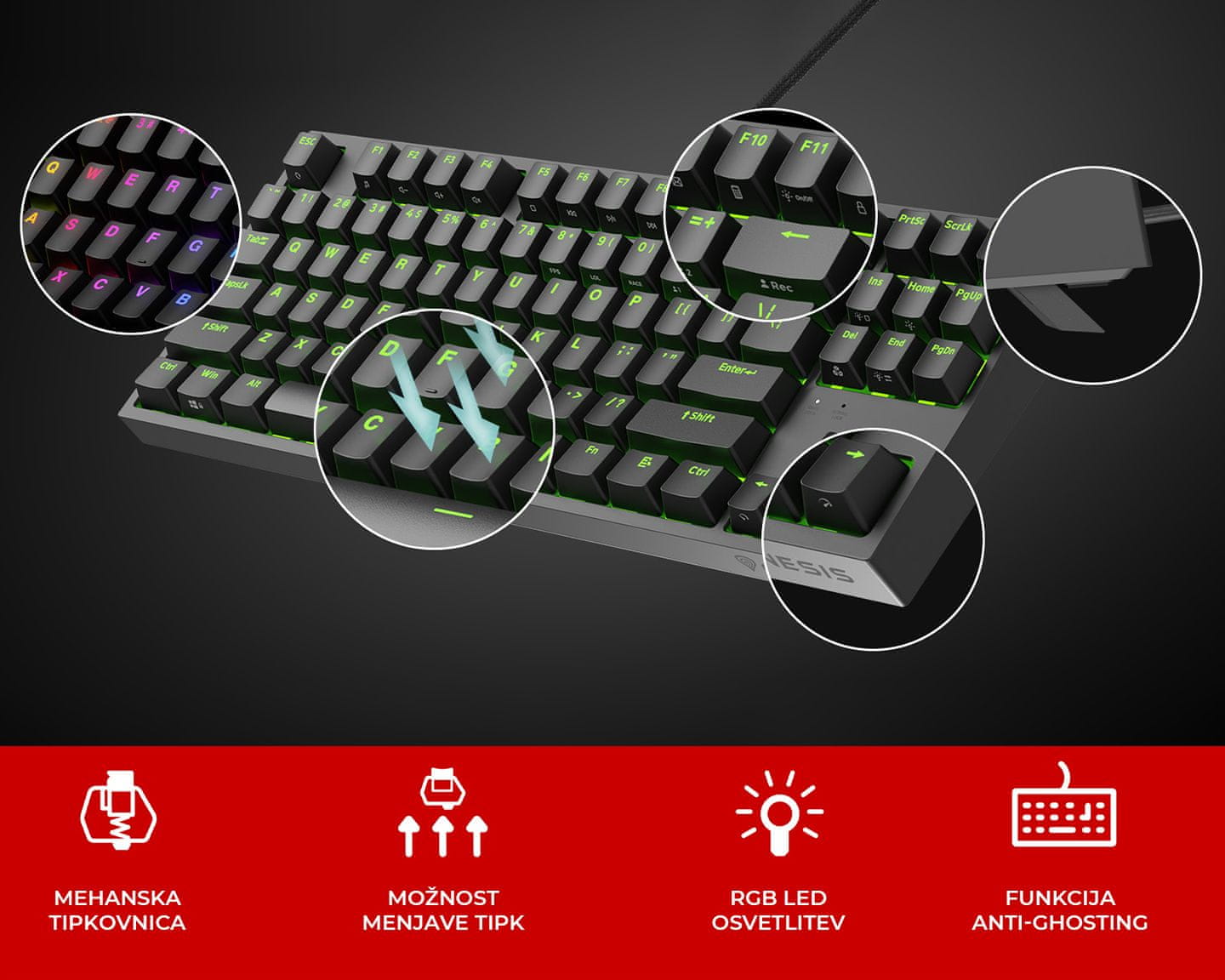 Genesis THOR 404 TKL je mehanska gaming tipkovnica, ki vas bo navdušila v vseh pogledih! Njen atraktiven videz – na voljo je v črni ali beli barvi – ji daje unikatnost, prav tako pa tipkovnico odlikujejo njene izjemne funkcije in prednosti pred konkurenco: