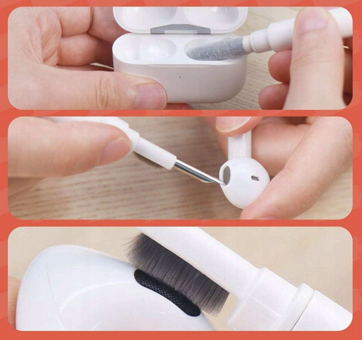 Značilnosti izdelka vključujejo: ✅ Specializirano konico za čiščenje težko dostopnih mest, kot so polnilni in slušalni priključki. ✅ Mikrovlaknena goba za natančno čiščenje zaobljenih površin, kot je notranjost ohišij slušalk. ✅ Majhna ščetka za odstranjevanje prahu iz ozkih prostorov. ✅ Velika ščetka za tipkovnico, ki učinkovito očisti prostore med tipkami. ✅ Sponka za preprosto odstranjevanje tipk s tipkovnice.