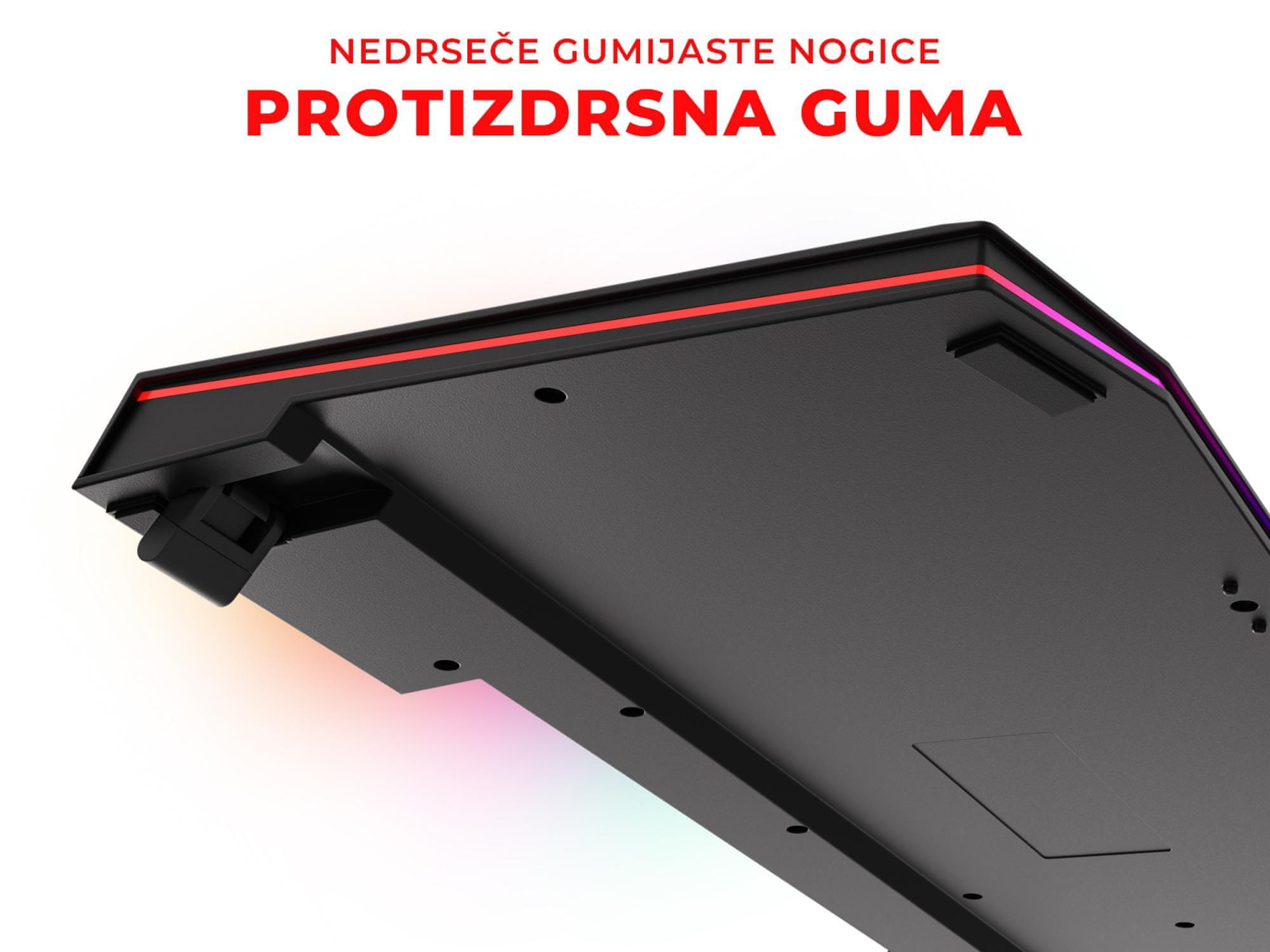 | Drugo | Dodatna programska oprema za nastavljanje osvetlitve, tipk, profilov in makrov Nizek profil: samo 25 mm Funkcija „Anti-Ghosting“ – za pritisk 19 tipk hkrati 12 funkcionalnih/multimedijskih tipk (od F1 do F12) Stojalo za telefon ali tablični računalnik Podaljšan spodnji del tipkovnice za boljši položaj zapestij Nogice s posebno protizdrsno gumo za boljšo stabillnost Možnost zaklenitve tipke Windows Združljivost: Windows XP, Windows Vista, Windows 10, Linux, Android 4.2.2 Vzdržljivost tipk: 20 milijonov klikov |