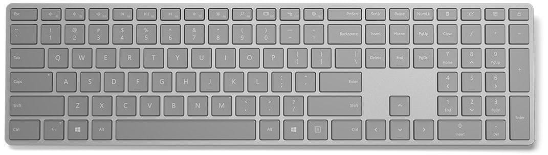 Bezdrátová bluetooth klávesnice s jednoduchým a elegantním designem, dlouhou výdrží baterie až 1 rok a s tichými klávesami s nízkým profilem. Klávesnice podporuje šifrovací funkci AES přes Bluetooth a disponuje multimediálními klávesami a numerickou částí. Rozměry 420,9 × 19,3 × 112,6 mm. Hmotnost 419,3 g. US popisky kláves. Celoten opis