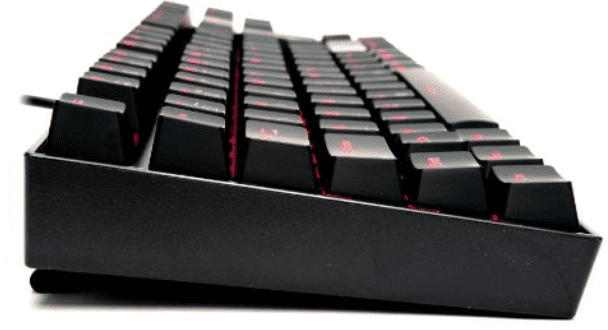 Tipkovnica je opremljena z enakovrednimi stikali Cherry Blue MX, ki zagotavljajo srednjo odpornost, značilen zvok klika in jasne povratne informacije. Osvetlitev tipk je prilagodljiva s svetlo rdečo LED osvetlitvijo, ki je nastavljiva v 19 različnih načinih ozadja in 6 stopenj svetlosti. Jasno in svetlo osvetljene tipke omogočajo optimalno igralsko izkušnjo tudi v temnejših okoljih.