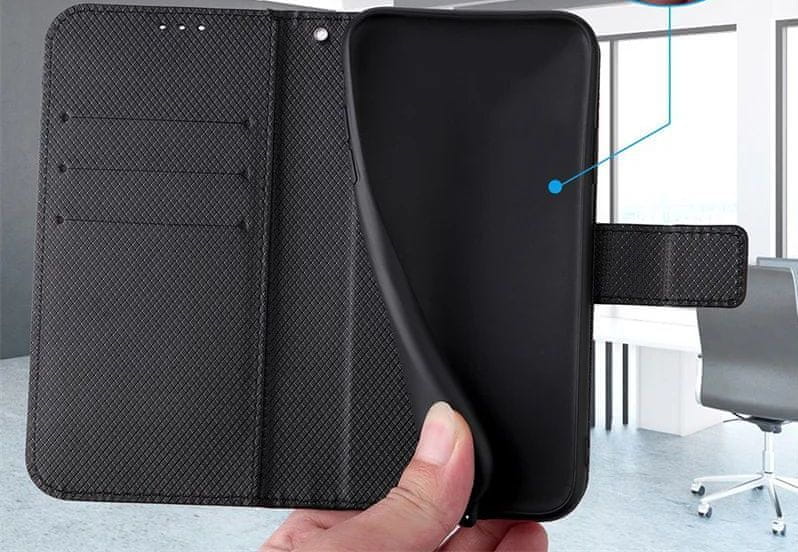 Telefonje nameščen na podlagi iz TPU, zato zagotavlja popolno zaščito in absorpcijo udarcev naše naprave med padcem. Vse skupaj se zapira z magnetno zaponko.
