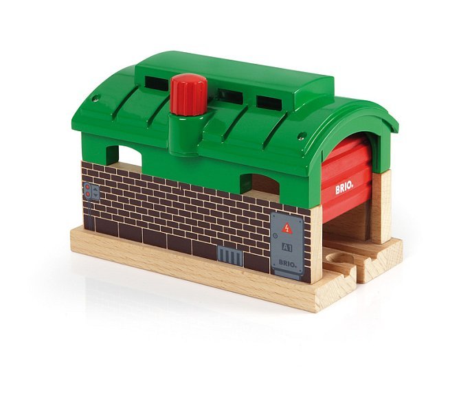 Leseno depo je odličen dodatek vsem železniškim progam. Obrnite rdečo ročico, da se odprejo vrata in vlak lahko zapelje v notranjost. Primerno za otroke od 3. leta dalje.
