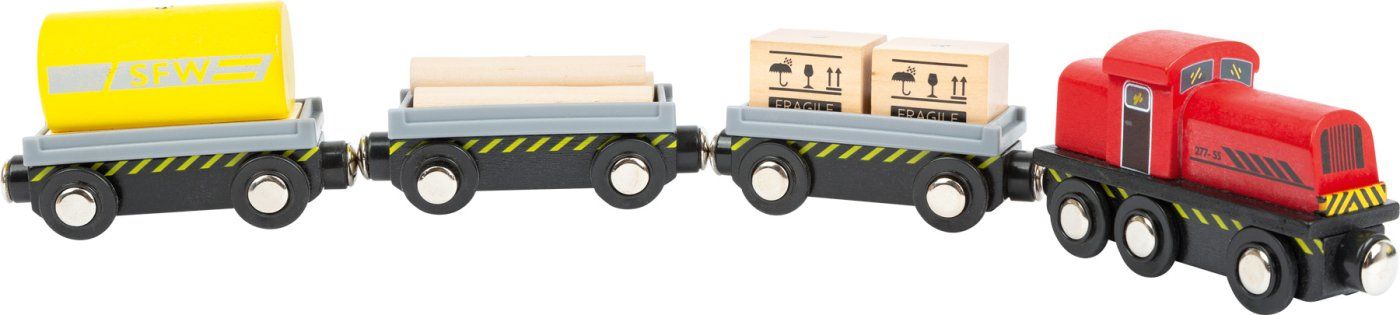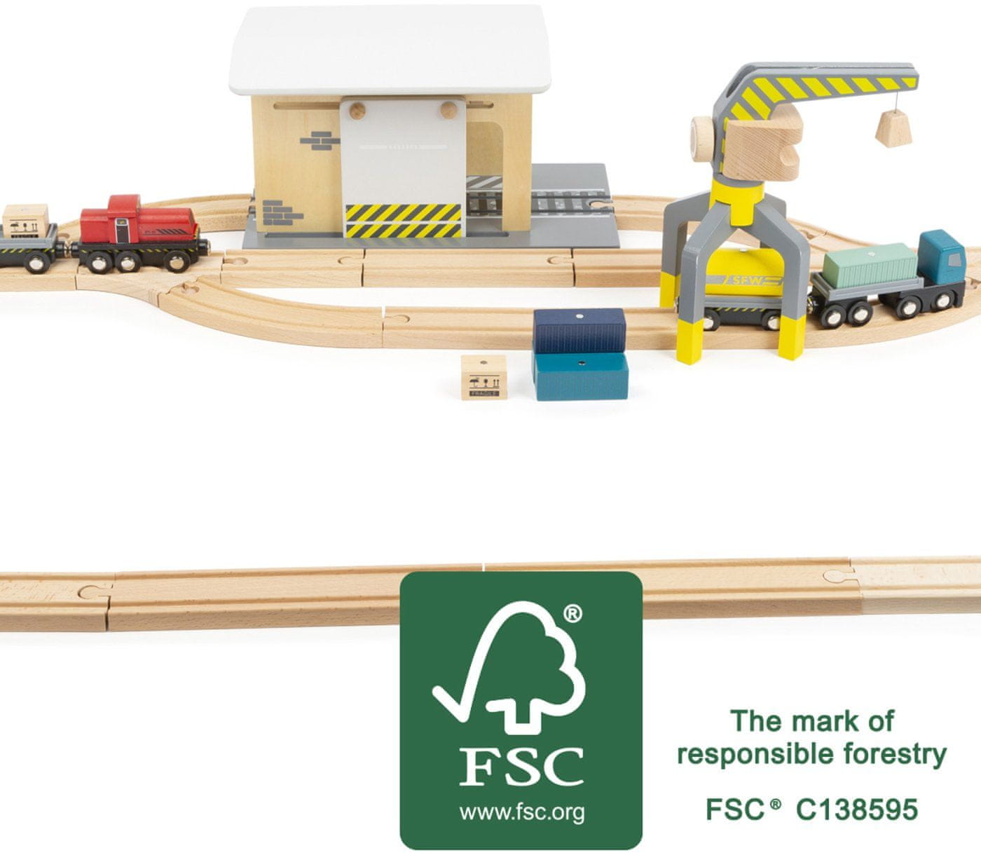 To tovorno skladišče, izdelano iz 100-odstotno certificiranega lesa FSC, je v koraku s številnimi železniškimi progami. Otroci lahko z žerjavom natovarjajo in raztovarjajo zabojnike ter jih po tirih prevažajo do depoja. Vključuje 25 tirov. Komplet dopolnjujejo magnetne lesene kocke z motivi tovora in zabojnikov, žerjav, ki se vrti za 360°, in vozila z magnetnimi prikolicami. Drsna stena v postajnem poslopju z vgrajenim škripcem omogoča prilagodljivost za različne tovore. Kakšno blago je v naslednji dostavi? Glavne značilnosti: komplet je združljiv z vsemi običajnimi vlakovnimi kompozicijami vsebuje 25 tirov izdelan iz 100 % lesa s certifikatom FSC Oznaka in certifikat FSC (Forest Stewardship Council) zagotavljata, da les, iz katerega je izdelek izdelan, ni bil nezakonito posekan in prihaja iz gozdov, s katerimi se upravlja na trajnosten ali naravi prijazen način, pri čemer se upoštevajo stroge okoljske in socialne zahteve. Oznaka FSC na izdelku pomeni, da z nakupom prispevate k varstvu gozdov in podpirate trajnostno, odgovorno ali naravi prijazno gospodarjenje, zaradi katerega so naši gozdovi stabilnejši, bolj zdravi, z naravno sestavo vrst in bolje kljubujejo negativnim učinkom podnebnih sprememb.