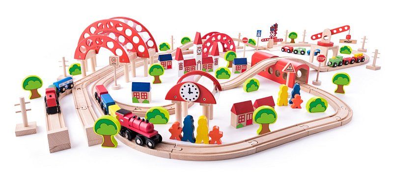 Vlakovna proga z originalnimi dodatki, ki jih je zasnoval češki oblikovalec, vsebuje 130 delov. Progo je mogoče vsakič zgraditi drugače, posamezne dele pa je mogoče kombinirati z drugimi vlakovnimi progami, ki so na voljo na našem trgu. | Starost: 3+|