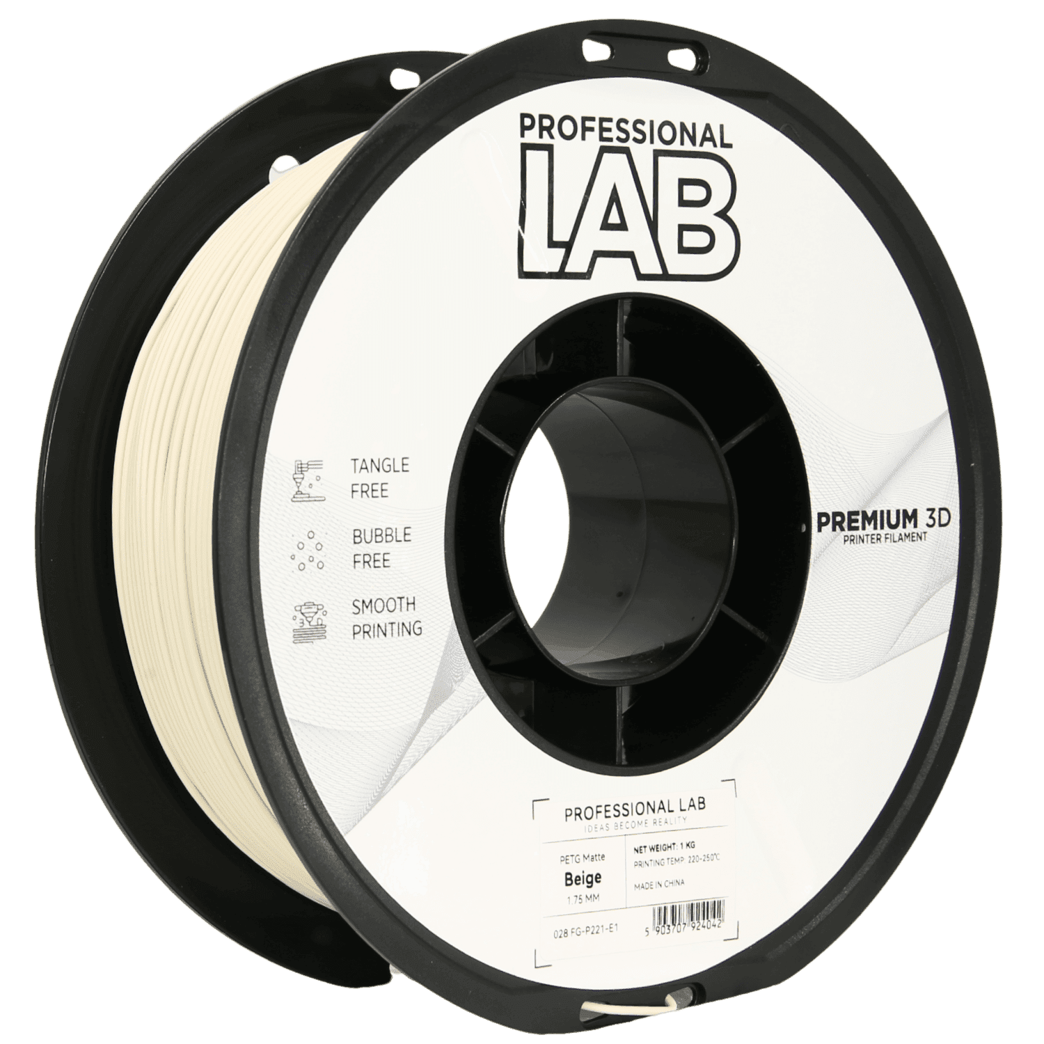 Mat bež PETG filament znamke Professional Lab, 1.75 mm, 5× 1 kg. Gladek satenast videz, dober oprijem, nizko zvijanje, odpornost na udarce in kemikalije. Celoten opis