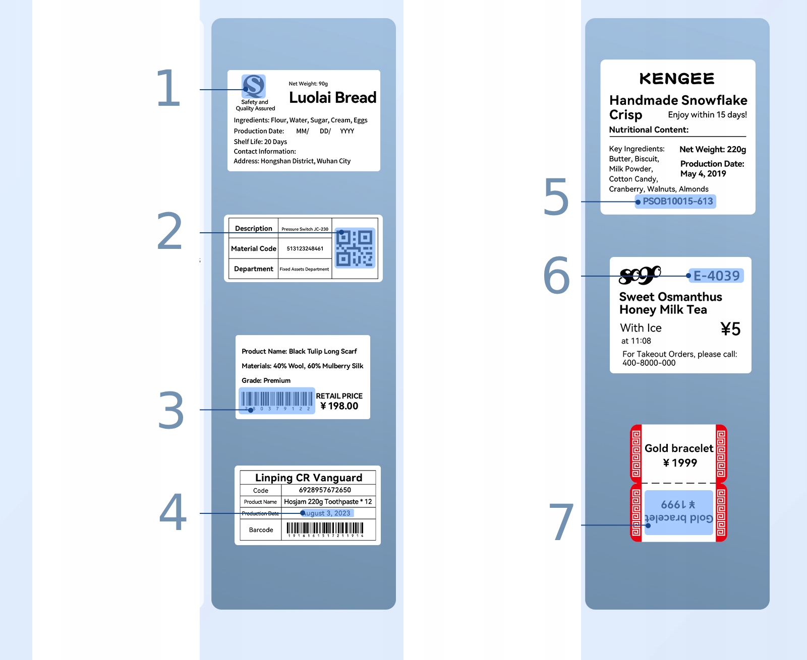 - Etikete za živila – informacije o sestavi, datumu uporabnosti in izvoru izdelkov