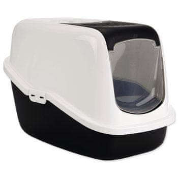 Stranišče za mačke s plastičnim pokrovom, vrati in filtrom.