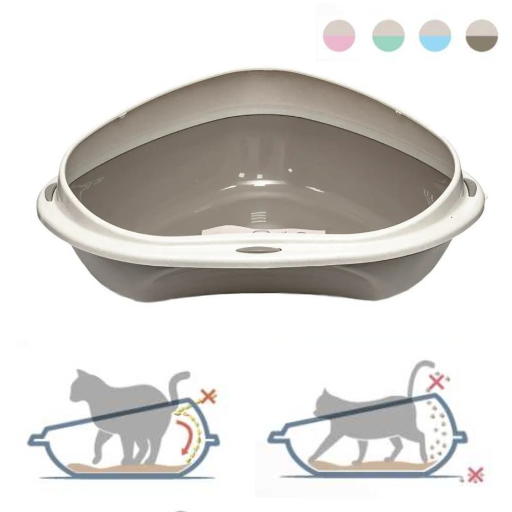 Kotno stranišče za mačke iz visokokakovostne in trpežne plastike. Dvignjen zadnji del za lažje zadrževanje smeti v notranjosti.