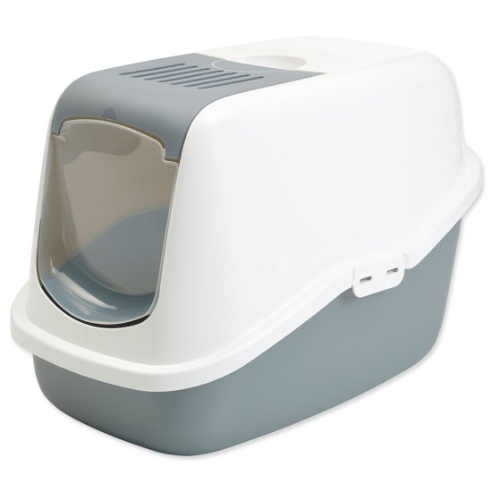 Mačje stranišče s plastičnim pokrovom, vrati in filtrom. Velikost: 56 × 39 × 38,5 cm.