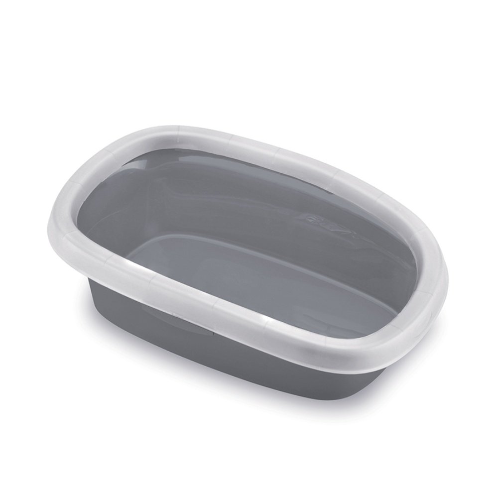 Prostorno odprto stranišče za mačke z ojačanim robom, ki preprečuje razlitje stelje.