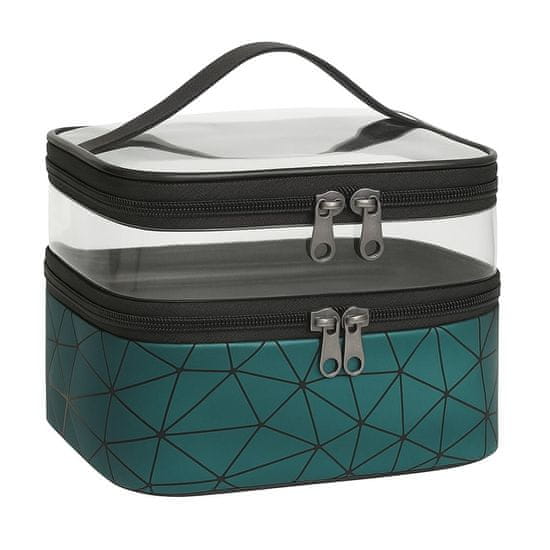 Kozmetična torbica – prostorna, ročaj za nošenje v roki, predal za ščetke, geometrijska oblika, prozoren vrh, dva predala na zadrgo, dimenzije 9 × 23 × 15,5 cm Celoten opis
