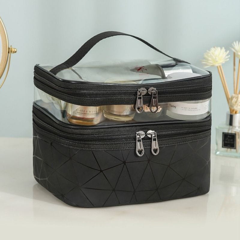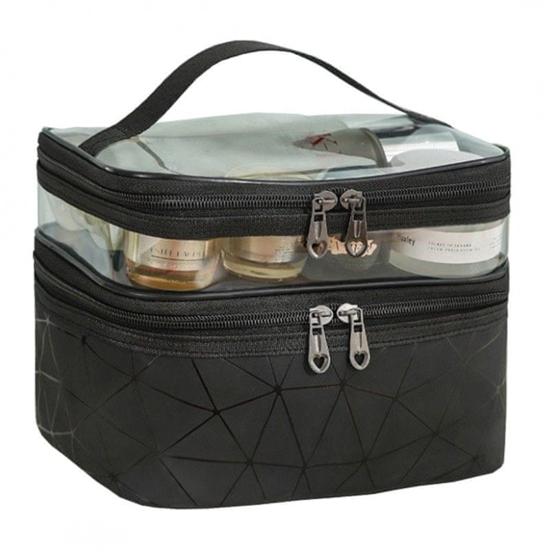Kozmetična torbica – prostorna, ročaj za nošenje v roki, predal za ščetke, geometrijska oblika, prozoren vrh, dva predala na zadrgo, dimenzije 9 × 23 × 15,5 cm Celoten opis