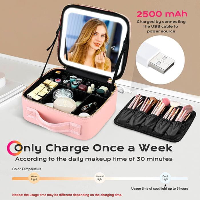 • Uporaba: Idealno za shranjevanje in organizacijo ličil. Ima prilagodljive predele. Preprosto odstranite stranice iz reže in jo vstavite v drugo režo. S pritiskom na gumb na ogledalu prižgete lučko in prilagajate 3 vrste svetlobe – hladno bela, naravna, toplo bela. Lučka ima USB kabel, preko katerega jo napolnite.