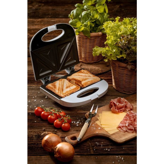 Uporaben opekač sendvičev s 750 W moči. Omogoča pripravo dveh sendvičev hkrati. Sendviča bosta razdeljena na 4 dele v obliki trikotnikov. Poseben premaz na grelnih ploščah preprečuje, da bi se hrana prijela nanje. Zato je vzdrževanje čistoče naprave zelo enostavno. Termostat signalizira, ko so plošče dovolj segrete, ter nadzoruje temperaturo in jo ohranja na stalni ravni med celotnim postopkom opekanja Tako so sendviči hrustljavi in zlati. Opekač sendvičev lahko shranjujete v navpičnem položaju – vse za udobje uporabnika.